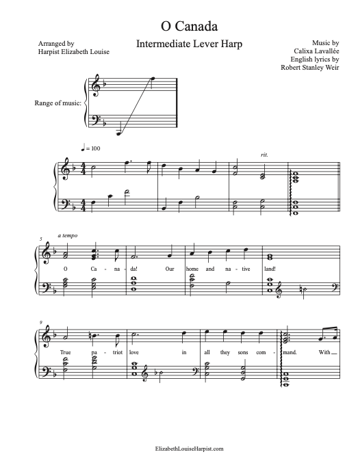 O Canada for Intermediate Lever Harp. This song has the lyrics written in and can be played on a standard 34 string lever harp. This sheet music for harp has some lever changes from B flat to B natural, as well as from C natural to C sharp. Enjoy this Canadian national anthem for solo harp.